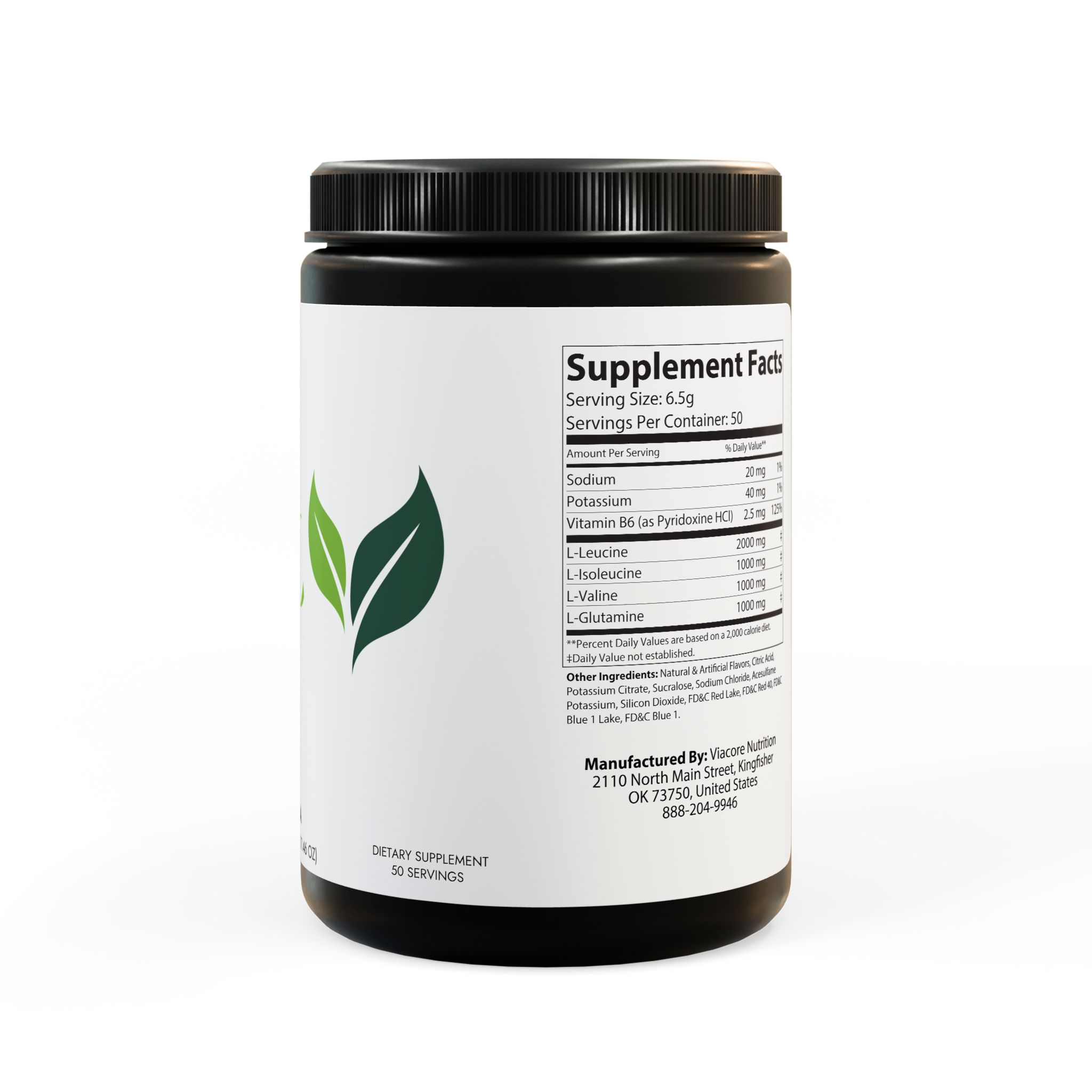 Key ingredients include Sodium, Potassium, Vitamin B6 (as Pyridoxine HCl), L-Leucine, L-Isoleucine, L-Valine, and L-Glutamine.