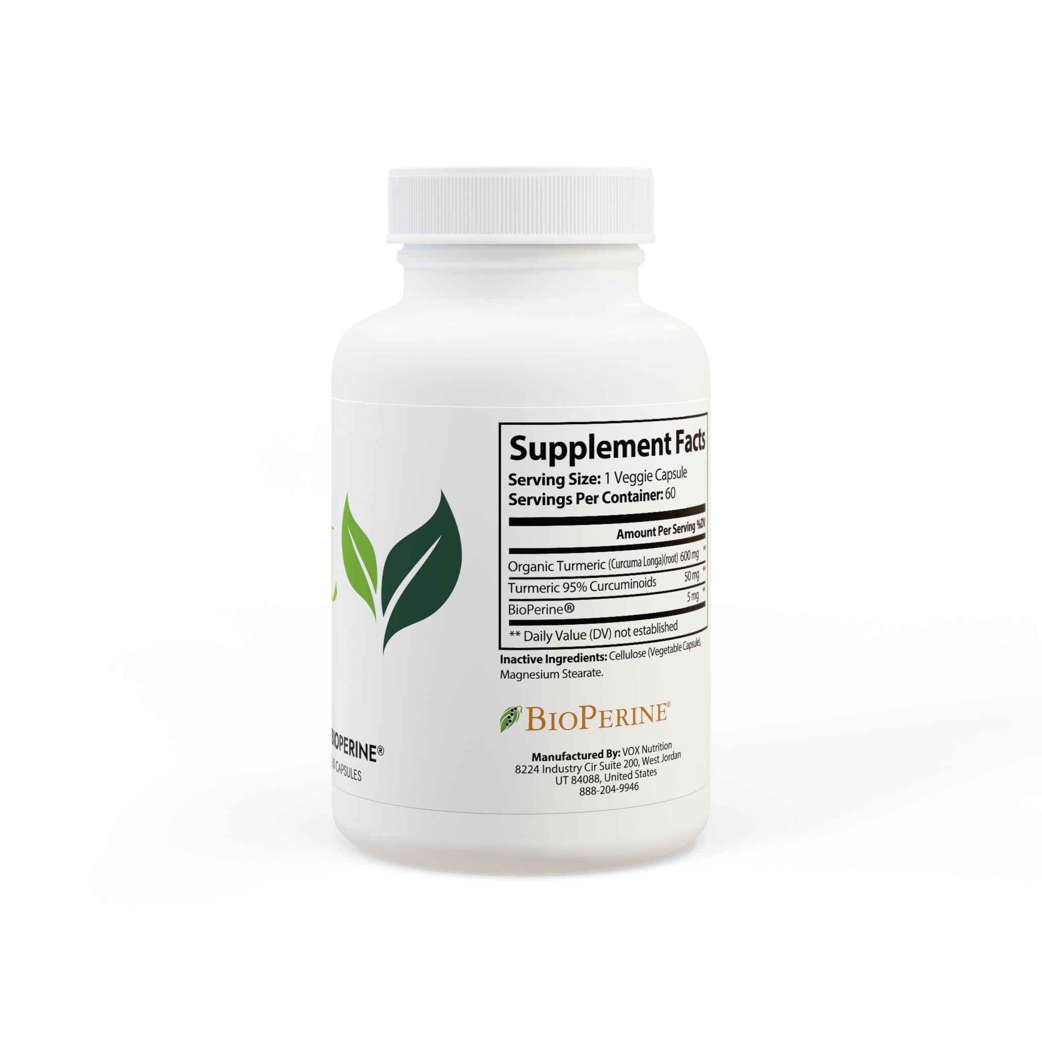 Ingredients: Organic Turmeric (Curcuma Longa)(root), Turmeric 95% Curcuminoids, BioPerine. Inactive Ingredients: Cellulose (Vegetable Capsule), Magnesium Stearate.